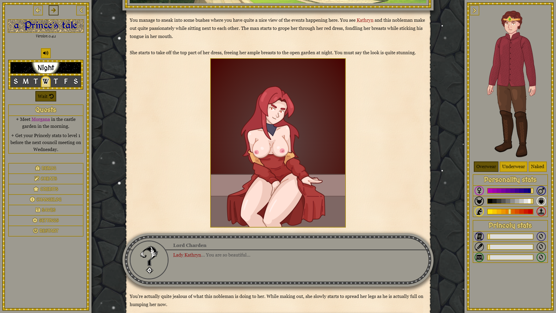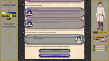 A Prince's Tale is a free-to-play text based erotic adventure game. You play as the prince of a fantasy kingdom. Recently, your father, the king, has left the kingdom in your hands. You are expected represent him in the royal council, where each councilor is looking to mentor you in some way, perhaps to benefit their own agenda. Especially the new royal sorceress seems keen on guiding you using her strange transformative magical powers...
